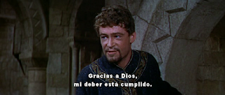 Canciller le está traicionando) (Un monje llega hasta el aposento de Becket) "Su Ilustrisima"... "Sí"... "El Rey está aquí"... (Becket duda) "¿Estás seguro?"... "Ha venido a caballo y solo, pero estoy seguro de que es él" (Becket sorprendido, exclama) "Mi Príncipe"... (Henry le pregunta) "¿Por qué enviaste un mensajero?"